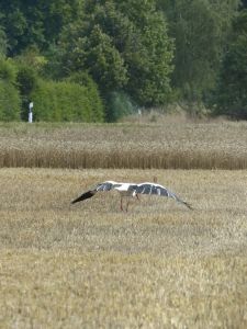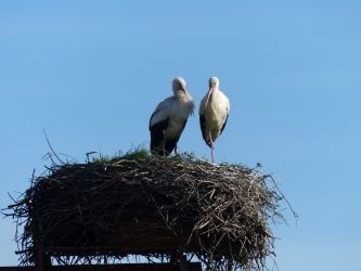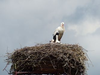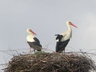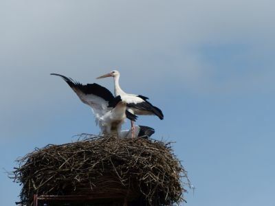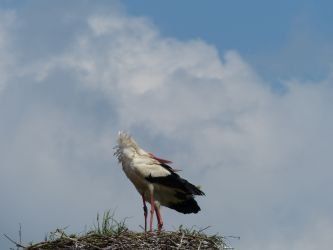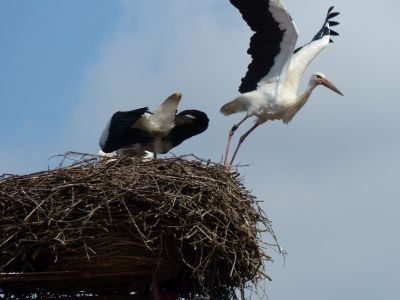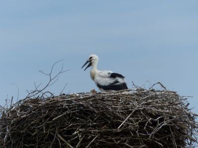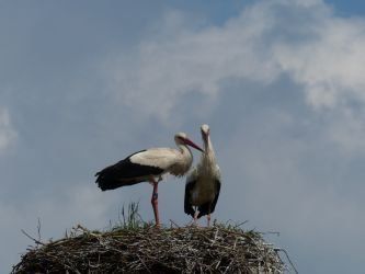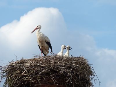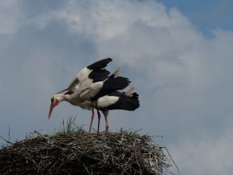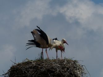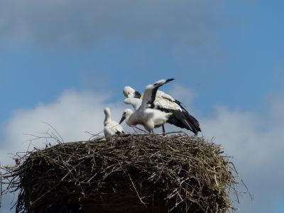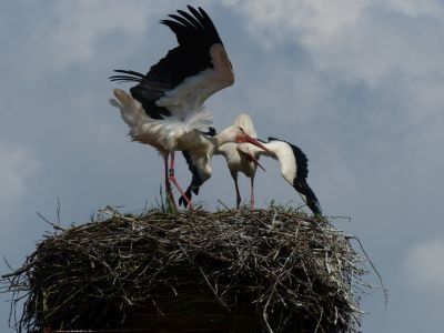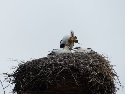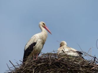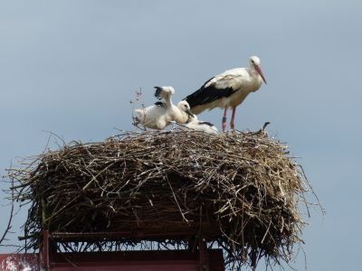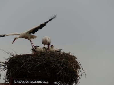 Beide Elternteile sind auf Futtersuche. Sehr schnell wachsen die Jungstörche herran, anfangs nehmen sie mehr als ihr halbes Körpergewicht an Nahrung zu.